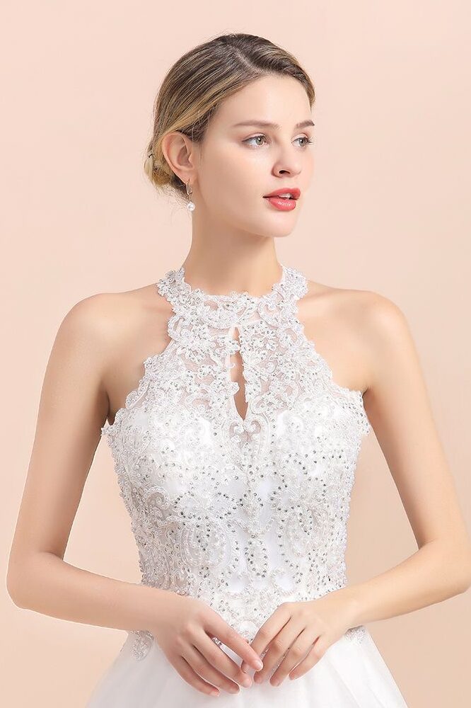 Cuello halter: se caracterizan por una tela que sube hasta el cuello y se ata con delicadeza alrededor de la nuca, dejando hombros, clavículas y espalda al aire.
